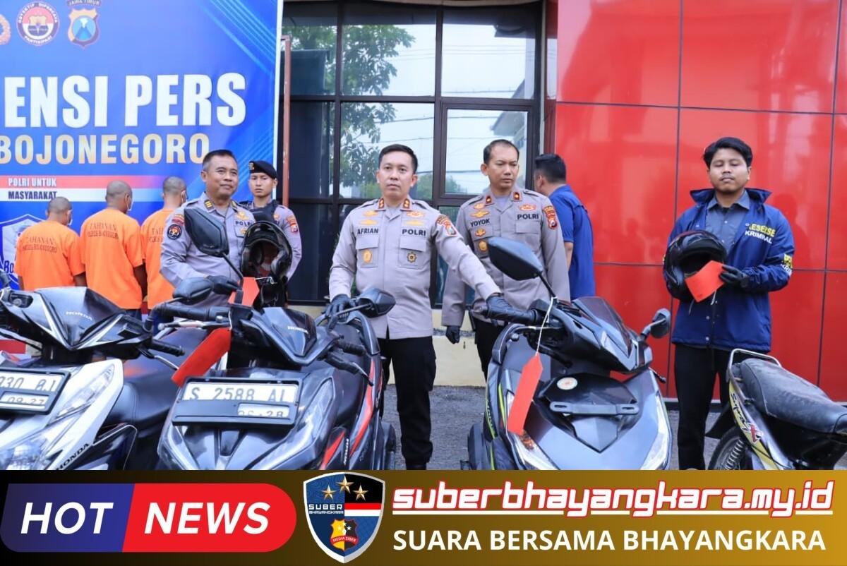 Kapolres Bojonegoro,AKBP Afrian Satya Permadi menjelaskan, Lima orang tersangka telah diamankan karena diduga terlibat dalam serangkaian aksi pencurian sepeda motor di wilayah Bojonegoro.