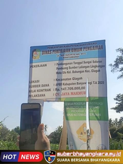 SUBERBHAYANGKARA.MY.ID, | Banyuwangi – Sebuah proyek pembangunan tanggul sungai saluran yang berlokasi di Lingkungan Watu Ulo, Kelurahan Bakungan, Kecamatan Glagah, menuai sorotan tajam dari warga setempat. Proyek tersebut dikerjakan oleh CV. Jaya Makmur, dengan sumber dana APBD Kabupaten Banyuwangi Tahun Anggaran 2025, bernilai Rp147.709.000,00.